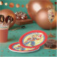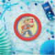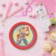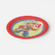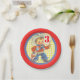 Western themed party plates with a little cowboy swinging a rope. The background is yellow check with a blue and red border.