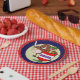 Western themed party plates with a rodeo clown inside of a barrel and a bull.
