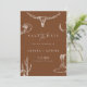 Celebrate your love with this rustic western cowboy wedding save the date card. This design features hand-drawn western illustrations including a longhorn skull, cactus, cowboy boots, horseshoe, and hat on a warm terracotta background. Perfect for couples planning a country, ranch, or western themed wedding.