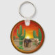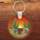 Sunrise highlights the cacti and little owl as it peeks above the sand dunes. Foreground features a corral fence with horse blanket and saddle.