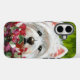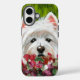 West Highland White Terrier and pink flowers. Westie dog peeking over a flowering bush. Sophie. Copyright © 2025 Angi Laframboise. Fine art dog breed gifts for dog lovers.