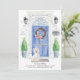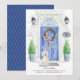 Announce your new address with our stylish announcement featuring a West Highland White Terrier, blue front door, welcome mat, slate sign, topiaries and a floral wreath set on a grey brick background.