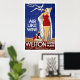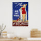 Vintage travel poster advertising the town of Weston-Super-Mare in the UK and issued by the New York Division of the Great Western Railway of England. It shows three elegant people enjoying themselves on the beach with the slogan "Air like Wine".