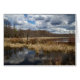 A dramatic sky reflects in the still water with wetland plants and trees.