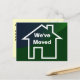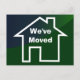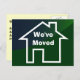 An outline drawing of a house in white lines over a dark green background. Features the text "We've Moved".