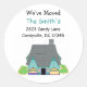A cosy house with unique design. A grey roof and a black door. A fun way to share your new address. Customise with your family name and address as desired.