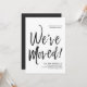 A minimal black and white script-style moving announcement card. It features a large script text of the words "We've Moved" followed by your address information below it. On the reverse side of the invitation is a deep charcoal grey colour to complement the look and feel. Most individual elements of the invite card are unlocked so feel free to change or add any details necessary by using the customisation function. You can even add a photo to the reverse side and add a black and white filter to it if you please instead of a message. Also, you can experiment with the many unique thicker paper types and cuts available.