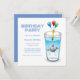 Birthday Party Invitation with a cute illustration of a little whale. The whale is wearing a red and white striped party hat and has started the birthday party which takes place in a filled water glass.