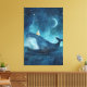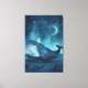 A serene watercolor illustration depicting a majestic blue whale floating under a starry night sky with a paper boat on its back. The moon and stars illuminate the tranquil ocean scene, creating a dreamy and whimsical atmosphere. This artwork adds a touch of peace and fantasy to any space.