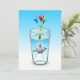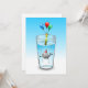 Pool party birthday invitation with a cute illustration of a little whale. The whale is wearing a red and white striped party hat and has started the birthday party which takes place in a filled water glass.