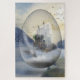 Description: The image depicts a fantastical scene enclosed within an egg shape. Inside the egg, there is a majestic castle perched on a cliff surrounded by mist and clouds. A whale's tail is visible at the bottom of the scene, giving the impression of a surreal, magical world. Birds are flying around the castle, enhancing the whimsical atmosphere. The background features a mountain range, adding to the sense of grandeur and otherworldliness.