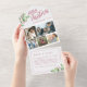 Modern elegant Merry Christmas handwritten brushed calligraphy script with 5 family photo collage tri fold year in review holiday card with your custom personalised text on both sides featuring green watercolor branches of botanical foliage with holy berries.