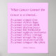 Text of 'What Cancer Cannot Do" Poem What Cancer Cannot Do Cancer is so limited... It cannot cripple love It cannot shatter hope It cannot corrode faith It cannot destroy peace It cannot kill friendship(s) It cannot suppress memories It cannot silence courage It cannot invade the soul It cannot steal eternal life It cannot conquer the spirit. -Author Unknown This poster print makes an inspirational cancer gift! Personalize with your own text and images using the "Customize It" button. Change the background color to your color of choice.