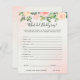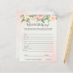 This baby shower game card features beautiful soft pastel watercolor roses and peonies in shades of blush pink and peach with lush green botanical leaves and eucalyptus.