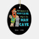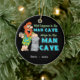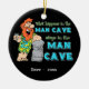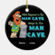 A red haired caveman leaning on a pile of stones and holding a cup in his hand is the centerpiece of this whimsical keepsake ornament. Text reads: "What happens in the man cave stays in the man cave." There is customisable text to add your name and additional information or, if you prefer, delete this text.
