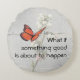 Round pillow with a floral background and a monarch butterfly with the saying What if Something Good is about to happen. Great gift to encourage a friend.