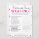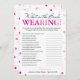 This modern What is the bride wearing game features a pink magenta background with metallic confetti. The text is written in a mix of a playful calligraphy font and a modern serif font, this card is personalised with the Bride-to-be name and the Bridal Shower date.