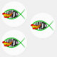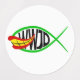 A parody design of the Ichthys (Jesus Fish). The design of the Ichthys fish, mashed up with the Joker Fish from a comic book cartoon. WWJD in black text is inside the fishing, asking, "What Would Joker Do?"