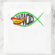 A parody design of the Ichthys (Jesus Fish). The design of the Ichthys fish, mashed up with the Joker Fish from a comic book cartoon. WWJD in black text is inside the fishing, asking, "What Would Joker Do?"