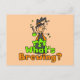 A stick figure witch makes a magic potion on Halloween T-shirts, sweatshirts, cards, stickers, mugs, trick or treat tote bags, and other Halloween stick figure witch apparel and gifts. Text reads What's Brewing?