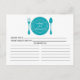 Contemporary Bridal Shower Kitchen Recipe Cards featuring a stylish blue dish with a fork & spoon set on a crisp white background. The front of our recipe card offers room for a recipe title, from the kitchen of and ingredients space. Flip our recipe card over to view directions, prep time & total time. Visit our shop for matching bridal shower invitations Available in our shop in a large assortment of popular wedding shower colours. Perfect bridal shower invitation insert for your bridal shower invitations.