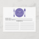 Contemporary Bridal Shower Kitchen Recipe Cards featuring a stylish purple dish with a fork & spoon set on a crisp white background. The front of our recipe card offers room for a recipe title, from the kitchen of and ingredients space. Flip our recipe card over to view directions, prep time & total time. Visit our shop for matching bridal shower invitations Available in our shop in a large assortment of popular wedding shower colours. Perfect bridal shower invitation insert for your bridal shower invitations.