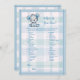 Adorable grey and blue baby bear for a boy's baby shower What's In Your Purse baby shower game. Plaid blanket with blue stitched edge border for background. Templates provided on back.