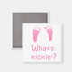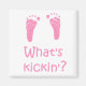 What's Kickin'? baby footprint magnet, with cute little baby feet in pink. Great baby shower favours, and perfect for hanging the ultrasound picture on the fridge! Also available in green or blue.