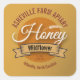 Customised honey jar label with a blade of wheat icon and golden amber sunburst with elegant script text "Honey", personalised with the name of the beekeeper or professional apiary, "Wildflower" or any honey nectar source, net weight and contact information.