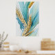 This watercolor print features a detailed stalk of wheat on a teal blue-green watercolor highlighted background. This unframed print is available in various sizes to fit standard frames.