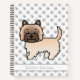 Destei's original cartoon illustration of a cute wheaten coat colour Cairn Terrier breed dog. Under the dog there is a personalizable text area for the title of the notebook. The background has a pattern of grey dog paw prints.