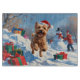 A joyful Soft Coated Wheaten Terrier runs through the snowy winter scene, wearing a festive red Christmas hat. This charming design highlights the breed’s soft flowing coat, cheerful spirit, and affectionate nature while capturing the warmth and joy of the holiday season. A delightful winter moment full of festive cheer.