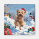 A joyful Soft Coated Wheaten Terrier runs through the snowy winter scene, wearing a festive red Christmas hat. This charming design highlights the breed’s soft flowing coat, cheerful spirit, and affectionate nature while capturing the warmth and joy of the holiday season. A delightful winter moment full of festive cheer.