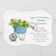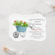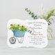 A charming invitation featuring a white background with a decorative, blue wheelbarrow full of poppies and white daisies. SHUTTERSTOCK