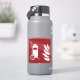 Wheeled fire extinguisher and flame icon on red background.
