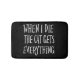 A black and white mug with a fun typography WHEN I DIE THE CAT GETS EVERYTHING in bold white letters.