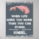 When Life Gives you More than you can Stand, Kneel Quote Posters and Prints. Inspirational Christian quote about prayer in vintage white typography and soft pink feather accent with antique white edges. See more at our store, Christian Quotes Shop. Link below: