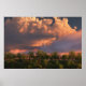"When March blow its horn, your barns will be filled with hay and corn." Behind the silhouettes of budding spring trees a flash of lightning breaks through the lowering clouds of a sunset sky.
