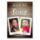 A modern, more original way to personalise your table numbers with childhood photos of bride and groom at that number age (the default is four). The placeholder photos of a little girl (the bride) and a little boy (the groom) have retro white borders, overlapping, in the lower half. The names of the bride and groom are written on the photos' lower white borders. In the upper part, there is the message "when we were four" with the age written in big white chalk like hand letters and the rest above, in smaller white caps (hand letters). In the lower part, under the two photos, there is the date, also written like in white chalk. The background is dark wood texture.