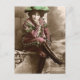 Vintage photo of a "cowgirl" in decorated and fringed outfit. Western hat is folded and bent at off angles. Colourized in mauve and green