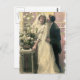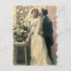 Vintage photograph of a bride and groom. The groom is behind the bride holding her waist and whispering into her ear.