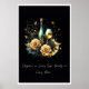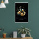 This sophisticated poster showcases an enchanting composition against a deep black background. At its centre stands an elegant bottle of wine with a shimmering turquoise-to-gold gradient, accompanied by a crystal glass filled with golden wine. The arrangement is adorned with luxurious roses in contrasting black and gold, surrounded by delicate gold leaves and decorative filigree elements. Golden stars and sparkling accents create a magical, celestial ambiance throughout the design. Artistic splashes of teal and gold add dynamic movement to the base of the composition. The elegant script at the bottom reads "Elegance in Every Sip. Beauty in Every Bloom," perfectly capturing the poster's marriage of fine wine appreciation and floral beauty. The overall aesthetic combines luxury, romance, and cosmic elements in a stunning visual celebration.