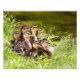 A delightful brood of mallard ducklings look out from their soft grass nook beside a quiet pond.