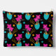 This hand-drawn pouch is covered with bright teal flowerpots and pink flowers which have whimsical curly accents. They are laid out on a bold black background. You can use it for stashing makeup, school supplies, or travel must-haves. The name is customizable.