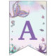 Complete your party with this whimsical mermaid flag banner decoration. Featuring a pretty mermaid and cute ocean creatures. Personalise it easily with a name and occasion or with any special message! Great for baby shower, birthday party, Christening / Baptism, New Baby and more! Simply change the letters to spell out your desired wording. You may need to purchase more than 1 set of bunting if your wording is very long.