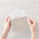 This unique and modern monochromatic all in one wedding invitation features a bold, flowy beige ampersand on a white background, with a simple and creative text layout that is sure to stand out.
