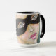 This fun mug is designed from my original painting inspired by a masked Marie Antoinette. My whimsical portrait style interpretation has big white hair, a black masquerade mask with white dot accents, pretty pink lips, and a beauty mark by her mouth all against a navy blue night time blue sky with gold star accents.