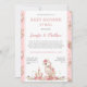 A beautiful Baby Shower By Mail invitation to celebrate the upcoming arrival of your little one. Features whimsical Mother and baby swans, with soft rose pink watercolor floral. Easily personalise with your party details. Back of card features baby swan design on soft pink background. Design©Rosalind Moore, Cherry Lane Designs.