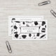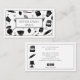 Eye catching modern, whimsical black and white baker bakery business card style, with cute whimsical illustrated baking kitchen utensils and ingredients, with little hearts, and pink background. Social media on the back.