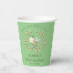 Whimsical baby shower themed paper cups features cute bee and flower wreath with customisable text on green background.